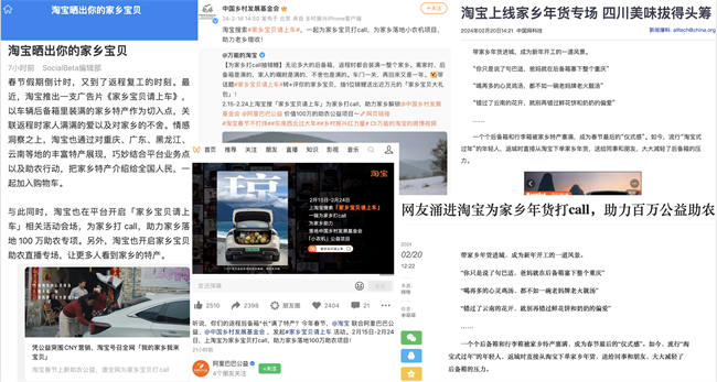 2月15日-2月24日期間,各政府單位協(xié)同方、淘寶美食行業(yè)、淘寶產(chǎn)地直播節(jié)、天貓汽車行業(yè)、阿里數(shù)字鄉(xiāng)村、淘寶陪你過年和百余家食品品牌等共同參與公益會(huì)場傳播,引導(dǎo)用戶加入公益助農(nóng)隊(duì)伍,傳播熱度高漲。