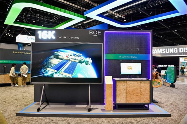 本次SID,BOE(京東方)攜三大技術(shù)品牌重磅首發(fā)的多款行業(yè)領(lǐng)先顯示技術(shù)和產(chǎn)品驚艷亮相。步入展區(qū),首先映入眼簾的是BOE(京東方)重磅首發(fā)的全球首款16K 110英寸超大尺寸裸眼3D顯示屏,并以超高清、超高分辨率、多視點、廣色域等優(yōu)勢突破了顯示行業(yè)的創(chuàng)新高度,該產(chǎn)品搭載高色域Mini LED背光技術(shù)以及BOE(京東方)自主研發(fā)的16K交織排圖算法,3D視角擴(kuò)大至60°,廣泛應(yīng)用于廣告、會議、教育等多元化場景。