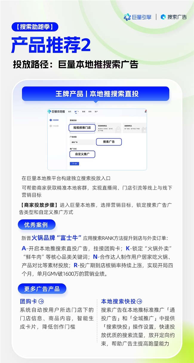 本地商家:本地商家想要獲取更多生意,首先要解決的就是本地客戶的獲客效率和原有商圈的距離限制。對(duì)此,巨量搜索推出「本地推搜索直投」、「本地搜索快投」等跑量產(chǎn)品,幫助本地商家實(shí)現(xiàn)精準(zhǔn)拓量,推出「團(tuán)購(gòu)卡」等產(chǎn)品,高效承接、轉(zhuǎn)化搜索用戶,提效商家生意增長(zhǎng)。
