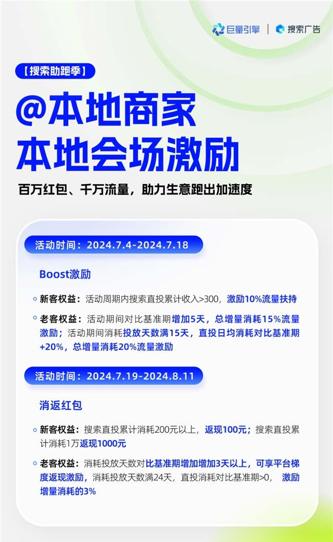活動(dòng)前30天搜索直投為0的新客,活動(dòng)前30天投過(guò)搜索直投的老客,活動(dòng)期間均可享受Boost激勵(lì)+消返紅包