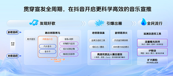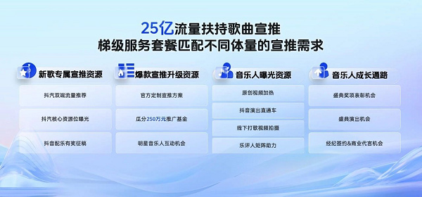 將會進(jìn)一步扶持更多元的音樂類型,推出和升級多個專業(yè)宣推工具輔助推歌,如音樂卡、配樂有獎、配樂面板流量推薦等,還與外部合作伙伴例如與Apple Music,展開圍繞歌曲以及音樂人的資源打通。抖音將會投入25億流量,從新歌宣推、爆款出圈、音樂人曝光、音樂人成長四大板塊,打造階梯式服務(wù)套餐,滿足不同體量音樂人的宣推需求,提供比以往更加全面的資源扶持。