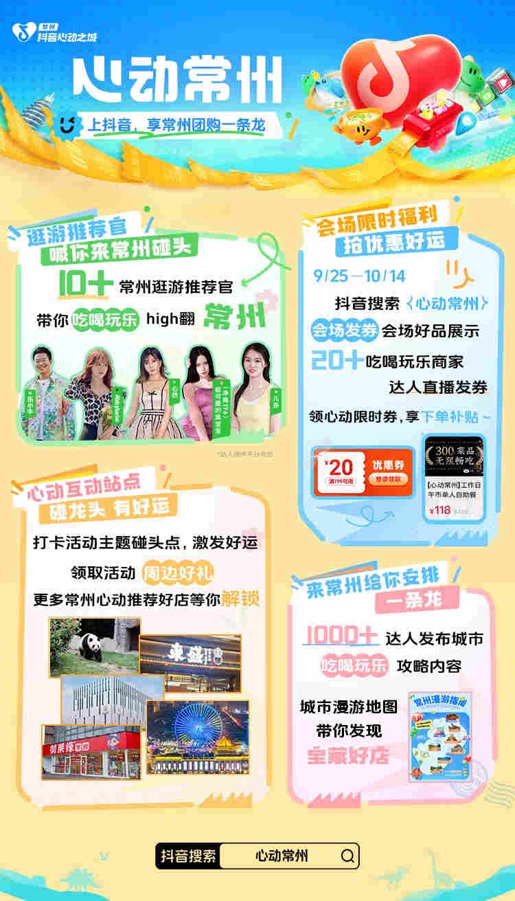為了助力本地文旅消費市場煥發(fā)新活力,9月25日至10月14日,抖音生活服務(wù)推出「心動常州」活動,以“上抖音,享常州團購一條龍優(yōu)惠”為主題,攜手常州本地眾多家餐飲酒旅商家打造“吃喝玩樂購”一條龍服務(wù),通過線上線下多樣活動形式,融合常州本地特色文化,為來自大江南北的游客帶來一站式歡樂暢游體驗,也為廣大商家的長效經(jīng)營帶來更多可能,進一步釋放常州的文旅魅力。