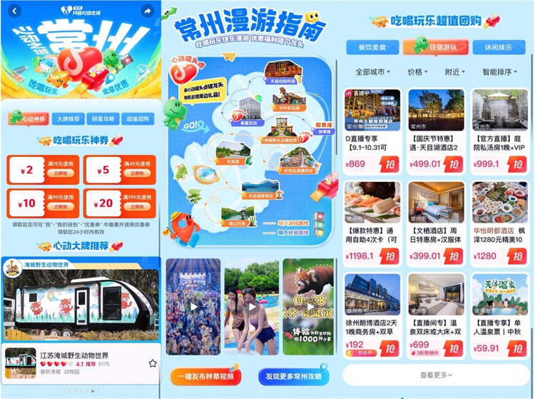串聯(lián)“吃住行游購娛”多種業(yè)態(tài),匯聚自助餐、特色菜等餐飲美食和主題樂園、動植物園等假期休閑消費全場景,「心動常州」通過“上抖音,享常州團購一條龍優(yōu)惠”,集結(jié)3000多品牌商家形成規(guī)模化效應(yīng),吸引八方來客“游在常州”。