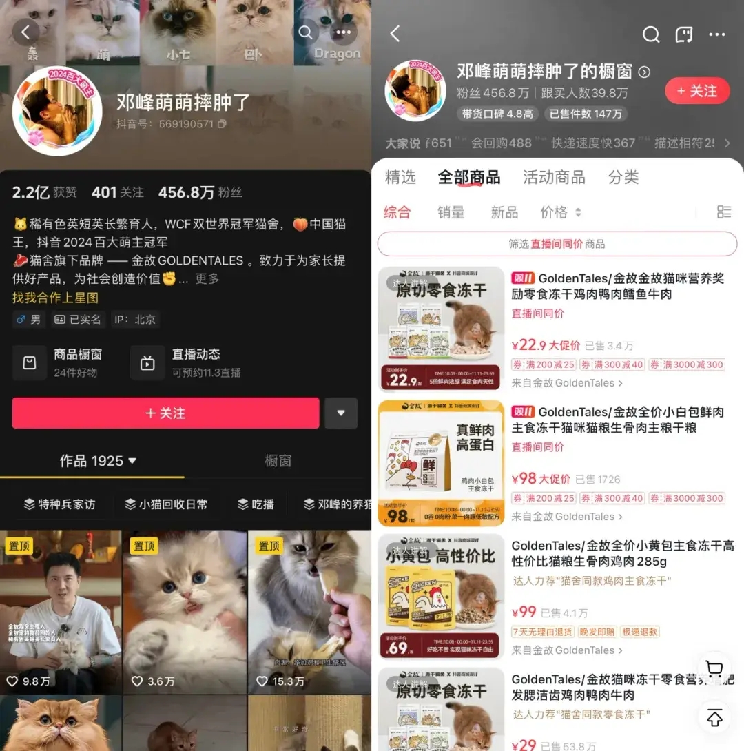 在今年抖音商城雙11好物節(jié)期間,金故推出的凍干貓糧等產(chǎn)品都受到了粉絲熱捧。