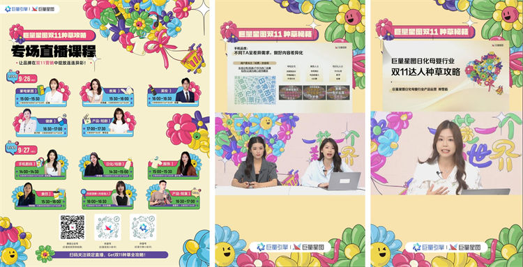 為了全方位營(yíng)銷布局的順利落地,巨量星圖在活動(dòng)開始前發(fā)布了針對(duì)美妝、服飾、日化等9大行業(yè)的雙11趨勢(shì)報(bào)告,為品牌提供了寶貴的市場(chǎng)洞察,助力品牌把握大促靈感。還同步開啟“好內(nèi)容走花路”星圖系列直播課程,11位巨量星圖行業(yè)產(chǎn)品運(yùn)營(yíng)專家通過分析消費(fèi)者需求和購買行為推出了針對(duì)性的種草策略。兩天時(shí)間收獲近42萬觀看量,其中視頻號(hào)觀看量達(dá)4.22萬,抖音端觀看量達(dá)37萬,互動(dòng)點(diǎn)贊量高達(dá)188萬。
