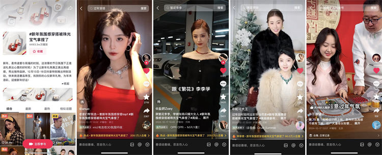 內(nèi)容型直播間熱火朝天,話題內(nèi)容與資源布局緊隨其后?;顒?dòng)期間,抖音商城推出#2025年的首飾盒交給我來(lái)填滿 、#新年氛圍感穿搭被珠光寶氣拿捏了 兩大熱點(diǎn)話題,不僅吸引眾多達(dá)人的內(nèi)容投稿,也引發(fā)了大批珠寶潮奢愛(ài)好者的共鳴與討論。