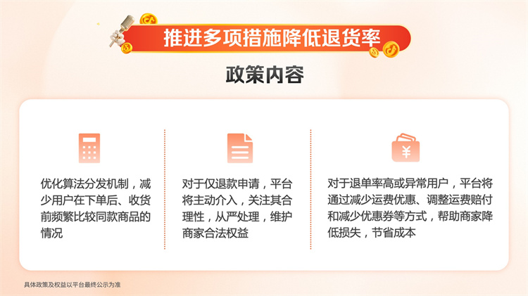 例如,對(duì)于退單率高或異常用戶,平臺(tái)將減少運(yùn)費(fèi)優(yōu)惠、調(diào)整運(yùn)費(fèi)賠付和減少優(yōu)惠券等,幫助商家降低成本。對(duì)于僅退款申請(qǐng),平臺(tái)將主動(dòng)介入,關(guān)注其合理性,從嚴(yán)處理。