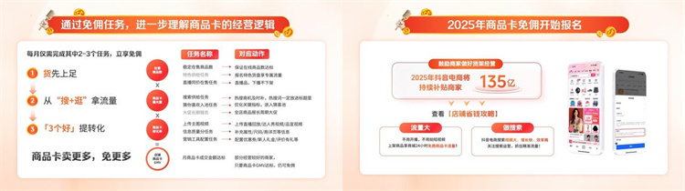 在消費(fèi)者搜索意愿不斷增強(qiáng)的趨勢(shì)下,商品卡作為承接搜索流量和銷(xiāo)售轉(zhuǎn)化的紐帶,重要意義愈發(fā)凸顯。商品卡的特點(diǎn)是低成本、全天24小時(shí)在崗。只要商品卡運(yùn)營(yíng)得當(dāng),商家不必全天上播也能等錢(qián)到賬。直播期間,抖音電商商家策略運(yùn)營(yíng)王肖肖分享了一組數(shù)據(jù): 去年,通過(guò)商品卡免傭政策,抖音電商為超150萬(wàn)商家累計(jì)節(jié)省成本超100億元。以嬌潤(rùn)泉官方旗艦店為例,免傭超一千萬(wàn)。今年隨著新一輪利好政策集中釋放,平臺(tái)全年補(bǔ)貼金額將高達(dá)135億,給商家?guī)?lái)持續(xù)激勵(lì)和扶持。賣(mài)得越多,免得越多!