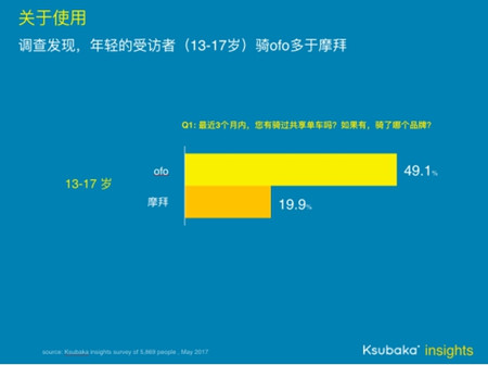 不同于摩拜和ofo所發(fā)布的側(cè)重于行業(yè)與市場(chǎng)發(fā)展的大數(shù)據(jù),“促巴卡大數(shù)據(jù)洞察”偏重于消費(fèi)者使用行為、使用偏好和使用動(dòng)因的分析。 基于強(qiáng)大的“體驗(yàn)站playSpot”網(wǎng)絡(luò),促巴卡收獲近26000 份跨越中國(guó)120座城市 的消費(fèi)者實(shí)時(shí)問(wèn)卷反饋??捎^的數(shù)據(jù)基礎(chǔ)令這份行為大數(shù)據(jù)揭示了更多有趣、有意義的全新洞見(jiàn),比如:促巴卡發(fā)現(xiàn),在13到17歲的青少年用戶群體中,更多人使用ofo(49.1%) ;