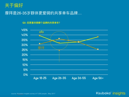 而在26到35歲的用戶群體中,摩拜則更受青睞,該年齡層中超過(guò)35%的用戶更愿意使用摩拜 。