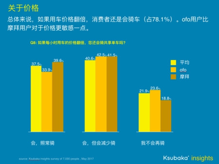 最后,大家最關(guān)心的價(jià)格問(wèn)題,如果用車(chē)價(jià)格翻倍,消費(fèi)者還會(huì)騎車(chē)嗎?大多數(shù)受訪者(78.1%)表示仍然會(huì)騎車(chē),而其中ofo用戶比摩拜用戶對(duì)于價(jià)格更敏感一點(diǎn)。