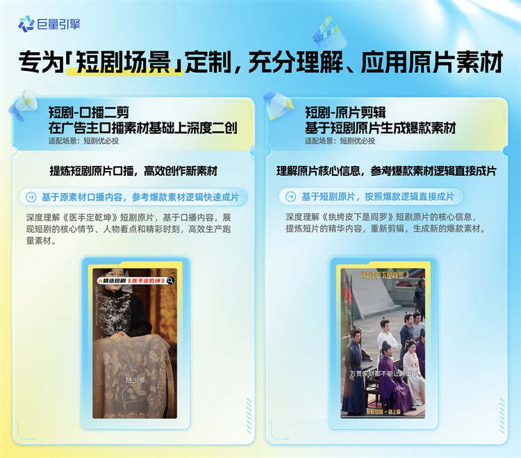 當(dāng)前,短劇營銷火熱,正成為品牌搶占用戶心智的關(guān)鍵。在短劇場景下,如何高效產(chǎn)出優(yōu)質(zhì)素材?「短劇-口播二剪」精準(zhǔn)提煉原素材的口播內(nèi)容亮點(diǎn),深度理解原片,契合爆款邏輯生成新的視頻,助力廣告主達(dá)成更優(yōu)營銷效果。無需依賴復(fù)雜剪輯,「短劇-原片剪輯」會(huì)基于短劇原片的核心信息,按爆款素材邏輯,直接生成高質(zhì)量視頻素材,省時(shí)省力,助推廣告主在短劇賽道快速布局、搶占流量。