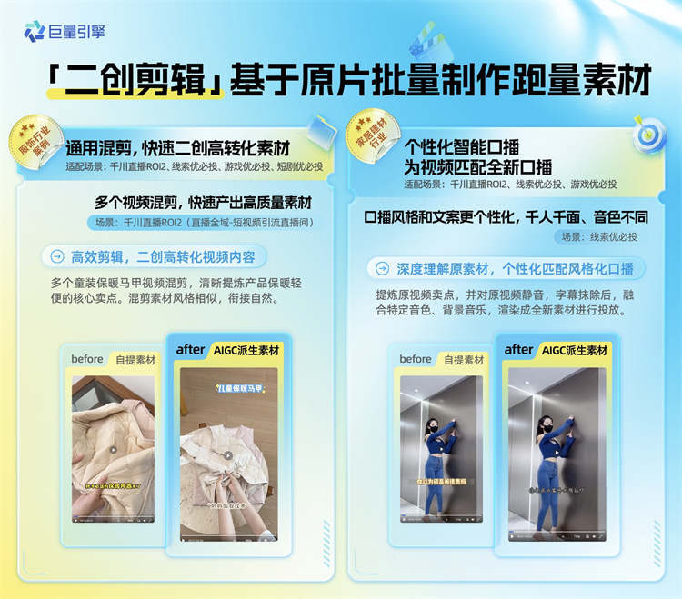想要延續(xù)爆款素材的跑量潛力,如何批量二創(chuàng)?「通用混剪」通過AI智能分析歷史優(yōu)質(zhì)素材,自動(dòng)拆解分析爆款視頻的畫面、節(jié)奏等元素,智能調(diào)整變速、轉(zhuǎn)場等視頻結(jié)構(gòu),從而快速產(chǎn)出符合跑量預(yù)期的視頻。「個(gè)性化智能口播」深度分析商品信息,結(jié)合目標(biāo)用戶的年齡、興趣等,重新生成個(gè)性化的口播腳本,并配合原有畫面,智能生成新素材,提升素材轉(zhuǎn)化效率。