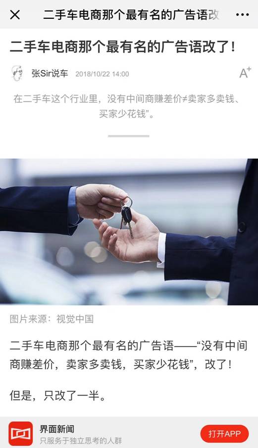 據(jù)了解,除了在外部廣告語上去掉了“賣家多賣錢,買家少花錢”,二手車直賣電商廣告語“沒有中間商賺差價”已經(jīng)弱化:在該二手車直賣電商官方網(wǎng)站上,原本以“沒有中間商賺差價”為核心文案的大圖廣告悄然下線,此前與“沒有中間商賺差價”相關(guān)的字樣消失無影無蹤;在其最新的TVC廣告中“沒有中間商賺差價”的畫面展現(xiàn)字樣也變得非常小,且與其相連的后半句文案文案也大換血。而之前,在電梯、公交站、電視上,“沒有中間商賺差價”的廣告語幾乎隨處可見。