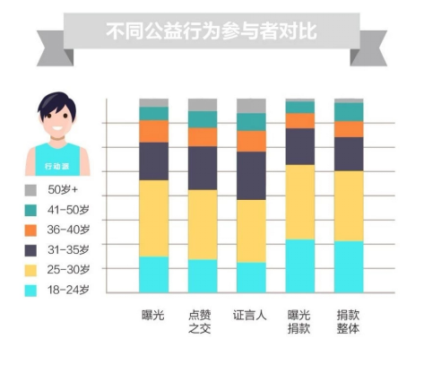 這個(gè)發(fā)現(xiàn)出乎意料卻又在情理之中,在質(zhì)疑聲中90后已經(jīng)成為了當(dāng)今社會(huì)的主力軍,活躍在不同的社會(huì)舞臺(tái),成為了公益事業(yè)中“說話少,干事多”的實(shí)干派。而已經(jīng)擁有一定社會(huì)影響力的40歲及以上的公益人群,則更偏愛通過轉(zhuǎn)發(fā)的方式幫助公益項(xiàng)目的傳播。