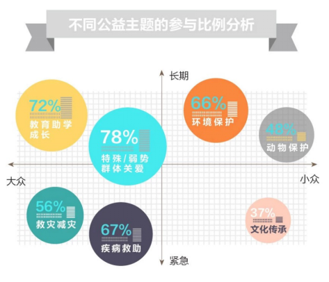 在豐富的選擇下,人們參與公益的方式也呈現(xiàn)出不一樣的特點(diǎn)。疾病救助、救災(zāi)減災(zāi)類的話題,非常容易引起人們的同情與同理心,捐款意愿最高。教育助學(xué)則和捐物更緊密地聯(lián)系在一起。對(duì)于動(dòng)物保護(hù)和文化傳承等相對(duì)不夠大眾化、且屬于特定人群的興趣話題,則容易激發(fā)同圈人的社交互動(dòng)行為。