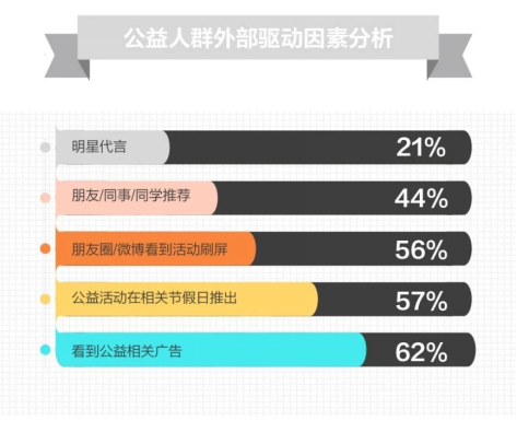 作為社交性動(dòng)物,人們天然對(duì)自己的身邊人更加信任,在朋友圈、微博等社交平臺(tái)看到刷屏活動(dòng)(56%),或者熟識(shí)之人的推薦轉(zhuǎn)發(fā)(44%),更會(huì)增加參與公益的概率。