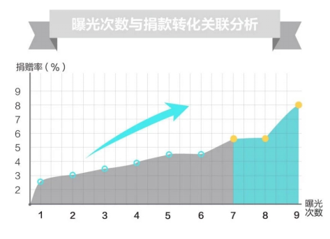 不言而喻,公益廣告曝光對(duì)捐款轉(zhuǎn)化也有著非常顯著的正向影響?!?”是一個(gè)神奇的數(shù)字,當(dāng)公益廣告曝光在7次以及以上時(shí),捐款轉(zhuǎn)化有顯著的提升。