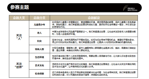 大賽延續(xù)上屆“創(chuàng)益大咖組”和“創(chuàng)益生態(tài)組”兩大組別設(shè)置,呼喚更多創(chuàng)益力量的加入。前者主要面向創(chuàng)意公司、或具有專業(yè)水平的廣告行業(yè)從業(yè)者,后者則面向NGO組織,或有志為公益項目提供創(chuàng)意的人士。在參賽主題方面,今年大賽設(shè)置了“關(guān)注人”和“關(guān)注世界”兩個板塊,聚焦兒童青少年、老人、婦女、特殊人群、生態(tài)環(huán)境、藝術(shù)文化、以及社會創(chuàng)新7大話題,參賽者可自由選擇命題及創(chuàng)意呈現(xiàn)方式。