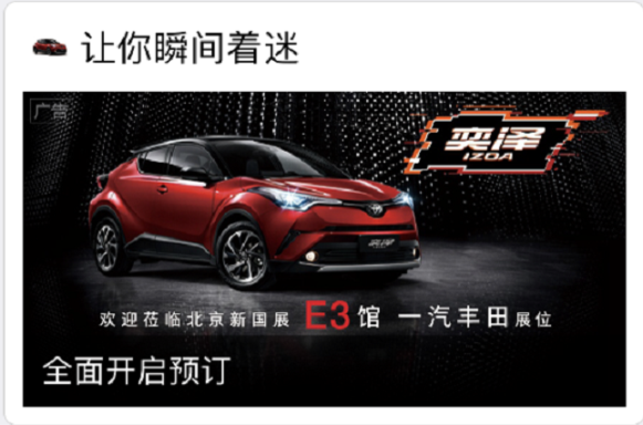搜狗正是洞察到新生代潮酷人群的這一特點,在推廣一汽豐田奕澤IZOA時,別出心裁地使用了一大亮點營銷方式,即當(dāng)用戶使用搜狗輸入法輸入“奕澤”、“豐田”、“車展”等關(guān)鍵詞時,或者是在安卓端任意場景下打開搜狗輸入法鍵盤,使用語音輸入“試駕豐田”、“豐田家用車”等短句時,就會看到一汽豐田奕澤IZOA的品牌廣告。