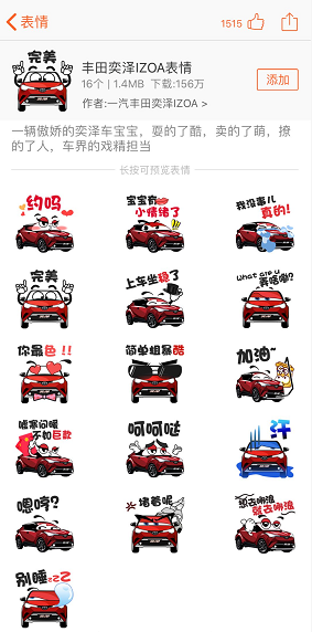 此外,表情包的優(yōu)勢也非常明顯,它可以通過產(chǎn)品的“擬人化”,模糊廣告與內(nèi)容的界限,從形式上實現(xiàn)“廣告即內(nèi)容”。在這場營銷盛宴中,通過定制表情包,借助一擊即中消費者內(nèi)心的文案,搜狗讓一汽豐田奕澤IZOA的品牌被用戶毫無芥蒂心理地接受和分享,并引發(fā)了精準(zhǔn)用戶群體的分享欲望。