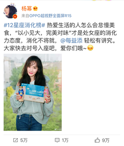 ??同時(shí),代言人楊冪從自己星座(處女座)的消化力語(yǔ)錄出發(fā),帶領(lǐng)微博KOL、微信KOL、網(wǎng)絡(luò)媒體資源全網(wǎng)集中引爆,以?shī)蕵?lè)化口碑化的方式對(duì)每益添消化力語(yǔ)錄創(chuàng)意包站最大化擴(kuò)散,想不引來(lái)流量都難。