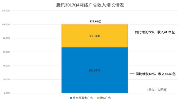 2018年3月21日,騰訊公布截至2017年12月31日未經(jīng)審核的第四季度綜合業(yè)績(jī)及經(jīng)審核的全年綜合業(yè)績(jī)。財(cái)報(bào)顯示,2017年騰訊全年收入人民幣2,377.60億元,比去年同期增長(zhǎng)56%。社交及其他廣告全年收入達(dá)256.1億元,第四季度收入同比增長(zhǎng)68%至人民幣82.40億元。