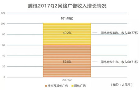 截止2017年第二季度,社交及其他廣告上半年總收入達到104.5億元,超過百億。