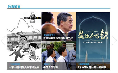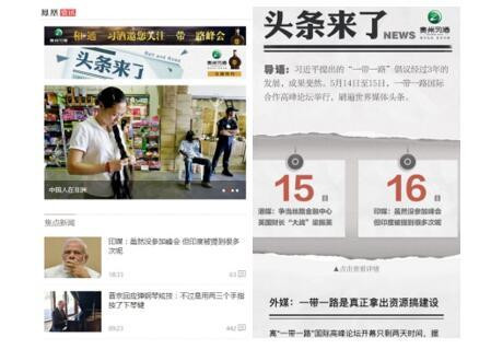 鳳凰網(wǎng)在一帶一路期間獨家策劃多角度多形式的報道內(nèi)容。用漫畫形式講解一帶一路內(nèi)涵的“大魚漫畫”;聚焦巴基斯坦中國人的融媒報道;展現(xiàn)習(xí)總書記發(fā)言和外國元首的兩個H5;落實一帶一路倡議的十大國貨評選……等等多檔策劃欄目,共獲得流量上千萬。其中,“頭條來了”是鳳凰網(wǎng)聯(lián)合習(xí)酒策劃的一個專題,主要整理國內(nèi)外媒體對一帶一路的報道,包括英國金融時報、美國CNN等全球性媒體,以體現(xiàn)一帶一路倡議的全球影響力。
