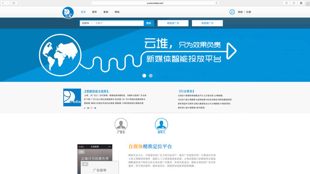 據(jù)新希望創(chuàng)新集團人士介紹,云堆新媒是一家成都的創(chuàng)業(yè)公司,成立于去年11月。該公司團隊主要來自傳媒、互聯(lián)網(wǎng)企業(yè)、科研院校。公司致力于移動互聯(lián)網(wǎng)新媒體的大數(shù)據(jù)分析、評估、監(jiān)測和原生廣告智能精準投放。旗下的云堆是國內(nèi)第一個上線運營的新媒體交易平臺?!霸诮衲?月談合作時,云堆已使用平臺技術為數(shù)十家廣告主和上千家自媒體提供了服務?!?
