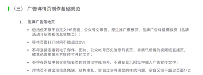 而《微信廣告制作規(guī)范》則對廣告制作提出了比其他平臺更高的要求。例如規(guī)定品牌廣告落地頁打開時間不能超過2秒,不得使消費者誤以為是自己好友在邀請,不得利用圖標或按鈕的操作功能誤導用戶,甚至還細化到了圖片顏色選擇等方面。