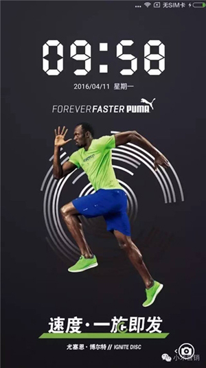 另外,小米為PUMA定制的個(gè)性主題還植入了一個(gè)“彩蛋”,每當(dāng)時(shí)鐘到9:58時(shí),用戶的小米手機(jī)就會(huì)出現(xiàn)博爾特的KV閃入作為鎖屏畫面,而選則這個(gè)時(shí)間,是暗映他9秒58的百米世界紀(jì)錄。