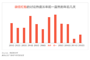 討論熱度數(shù)據(jù)顯示,“微信紅包”的社交聲量持續(xù)高漲,“QQ紅包”的社交聲量在除夕和初一出現(xiàn)峰值,有用戶表示“商家和明星噱頭十足!“,“雖然qq刷紅包刷到手軟,但是?。?!我還是很開心的?。?!”。