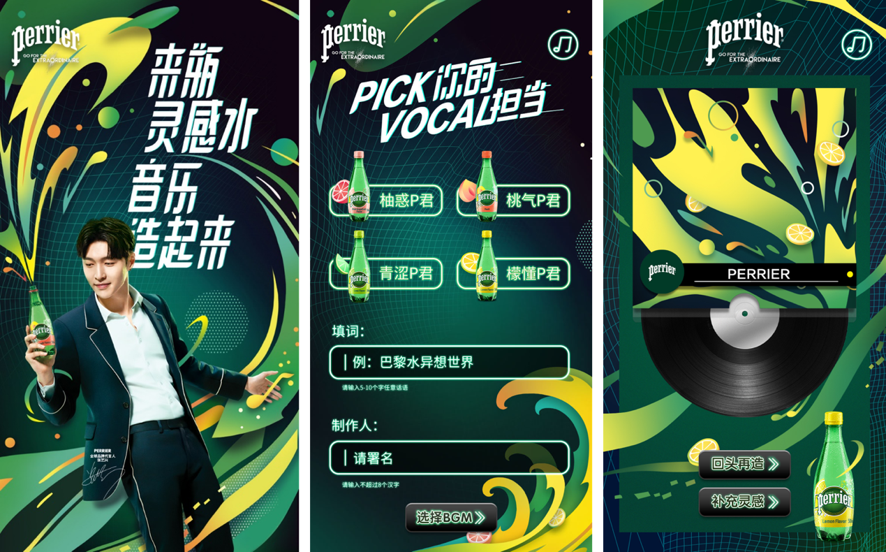 為了配合Perrier打碟機(jī)的設(shè)計(jì)理念,巴黎水還推出 “Perrier異想世界”天貓H5,鼓勵(lì)消費(fèi)者線上“造”音樂(lè)。開啟靈感水,pick最喜愛的vocal擔(dān)當(dāng),就可生成專屬靈感EP,解鎖酷炫的音樂(lè)玩法。
