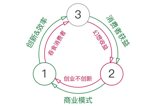 這個模型中,所有的新增價值都是消費者提供的,消費者提供的3塊錢中,1塊錢是自行車的價值,1塊錢被耗散掉了,1塊錢變成了利潤。這樣的循環(huán)是走不下去的,因為它的動力來源來自于說服或者說欺騙消費者接受質(zhì)次價高的產(chǎn)品,這本身就違反市場規(guī)律。