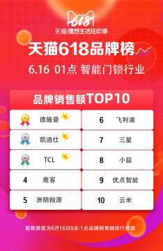 ▲ 6月16日前1小時(shí)天貓《智能門鎖行業(yè)品牌銷售額TOP10》