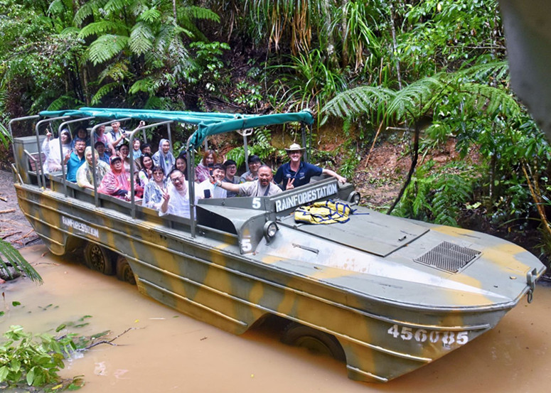 圖注:在熱帶雨林自然公園(Rainforestation)乘水陸兩用戰(zhàn)車探索熱帶雨林、與原住民共舞
