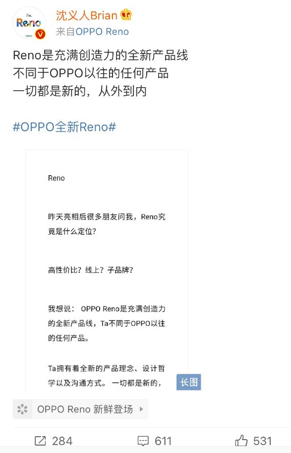 “在我看來(lái),Reno為什么一定要有一個(gè)含義?Reno是我們創(chuàng)造出來(lái)的,因?yàn)榍八从?,所以沒有標(biāo)準(zhǔn)答案?!苯?jīng)過(guò)11日一天的微博熱議,沈義人在今天發(fā)布的微博長(zhǎng)文中,又進(jìn)一步透露了Reno的一些細(xì)節(jié)。