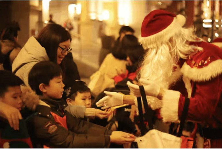 (圣誕老人向游客派發(fā)圣誕驚喜禮物)