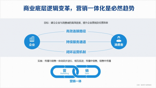 報(bào)告指出“營(yíng)銷(xiāo)一體化實(shí)施中強(qiáng)調(diào)傳播和銷(xiāo)售同步進(jìn)行、相互促進(jìn),傳播銷(xiāo)售化、銷(xiāo)售傳播化。通過(guò)構(gòu)建用戶連接關(guān)系,企業(yè)在用戶增量獲取、存量激活、閉環(huán)經(jīng)營(yíng)方面將獲得有力抓手?!?/span>