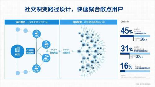《2018新?tīng)I(yíng)銷(xiāo)報(bào)告》建議企業(yè)在營(yíng)銷(xiāo)一體實(shí)操中,一方面要善于挖掘活躍的意見(jiàn)領(lǐng)袖和種子用戶,讓他們對(duì)營(yíng)銷(xiāo)內(nèi)容進(jìn)行再創(chuàng)造,擴(kuò)散營(yíng)銷(xiāo)聲量;另一方面,也要策略性地設(shè)計(jì)產(chǎn)生社交裂變的路徑,推動(dòng)用戶自發(fā)傳播,形成規(guī)模效應(yīng)。