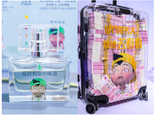 除此之外,展會的各個區(qū)域都被小茗同學(xué)的粉絲占據(jù),滿滿當(dāng)當(dāng)全是為小茗同學(xué)而高舉手機的!咔咔咔拍不停!區(qū)域內(nèi)還為到來的粉絲們準(zhǔn)備了各種各樣的衍生品供大家體驗購買,從膠帶、香水到卷筒紙各類品種無所不有。其中不乏一些相當(dāng)另類不走尋常路的產(chǎn)品,例如最讓全場為之震撼的——“狗shi味”香水!你要問我skr什么味?我只能說只可意會不可言傳~小茗同學(xué)真的是一如既往的不走尋常路!除此之外最喜歡的就是小茗同學(xué)透明炫富超明顯的行李箱,拉著出去絕對的人群中“亮點”!世界那么大,我要拖著小茗行李箱一起去看看~