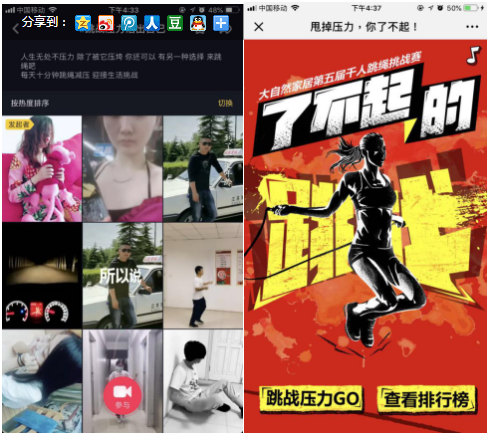 以紀(jì)錄片人物故事為核心,大自然家居層層遞進(jìn),借以時(shí)下年輕人愛(ài)看想看的熱門(mén)創(chuàng)意形式——長(zhǎng)圖文,將減壓精神二次創(chuàng)新,繼續(xù)在雙微發(fā)酵跳繩公益精神。此外,大自然家居更敏感地嗅到短視頻平臺(tái)的影響力,在抖音平臺(tái)發(fā)起“跳戰(zhàn)壓力,活出自己”跳繩公益比賽,網(wǎng)友們紛紛響應(yīng),拍攝上傳自己跳繩減壓的段子,引發(fā)了不起的跳戰(zhàn)熱潮。至此,大自然家居”了不起的跳戰(zhàn)”形成“雙微一抖”的傳播陣營(yíng),矩陣分布優(yōu)勢(shì)互補(bǔ),最大限度將活動(dòng)影響力擴(kuò)大化。為了呼吁大家積極應(yīng)對(duì)壓力,大自然家居設(shè)計(jì)開(kāi)發(fā)H5互動(dòng)游戲,將跳繩公益比賽推向全國(guó)。