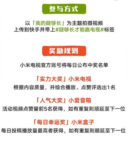 快來(lái)快手和75寸小米電視4比腿長(zhǎng),拍攝花式秀腿長(zhǎng)視頻,小米電視、小愛(ài)音箱等超多獎(jiǎng)品就能!誰(shuí)的腿長(zhǎng),誰(shuí)的人氣最高,就能把小米電視搬回家哦!