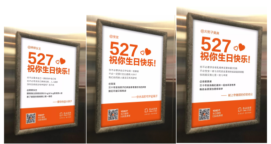 壹點(diǎn)壹客“527示愛(ài)”,通過(guò)前期網(wǎng)上征集,選擇最能打動(dòng)人心的2位粉絲告白蜜語(yǔ),制作成蜜語(yǔ)廣告牌,于深圳全城2000個(gè)電梯上線發(fā)布,上演一場(chǎng)全城浪漫,轟轟烈烈的實(shí)力寵妻故事。創(chuàng)意形式新穎、大膽,在情感溝通上更具共鳴。也因此吸引了眾多人的關(guān)注和主動(dòng)傳播,成為粉絲心中“最會(huì)告白”、“最會(huì)撩人”品牌。