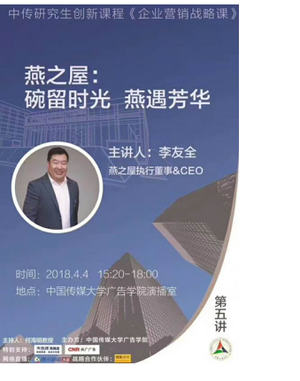 4月4日下午,燕之屋執(zhí)行董事兼CEO李友全在中國(guó)傳媒大學(xué)廣告學(xué)員演播室,開(kāi)展了題為“燕之屋:碗留時(shí)光 燕遇芳華”的課程演講,并榮譽(yù)受聘為中國(guó)傳媒大學(xué)廣告學(xué)院客座教授。