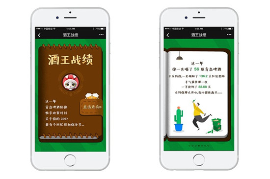 春節(jié)期間,千萬(wàn)的青島啤酒消費(fèi)者似乎都收到了一條記錄著自己2017年與青島啤酒有關(guān)的H5推送。這份“你的青島啤酒戰(zhàn)績(jī)”記錄了消費(fèi)者在這一年的歲月中所喝過(guò)的每一瓶青島啤酒,記錄了這一年里的每一次開(kāi)心、快樂(lè)、與好友歡聚的時(shí)刻。告訴消費(fèi)者你一年喝了多少青島啤酒,哪一天喝的最多……
