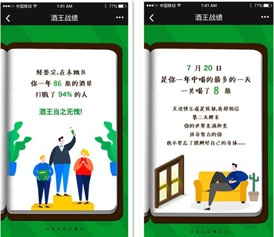 啤酒這一快消品相對(duì)較大的細(xì)分市場(chǎng),飲酒者對(duì)于數(shù)量的感知與比拼,無(wú)意是來(lái)自產(chǎn)品自身外最大的感官刺激。當(dāng)消費(fèi)者打開(kāi)這一份千人千面的基于自己喝酒行為的H5推送的時(shí)候,青島啤酒就像一個(gè)朋友一樣默默的記錄著他們,告訴每一位消費(fèi)者個(gè)體,這一年中他們與青島啤酒之間的故事。也許是驚訝,我那天能喝這么多?也許是好奇,我看看你喝了多少?潛移默化中,內(nèi)化于心外化與行,拉近了品牌與消費(fèi)者的距離。消費(fèi)者營(yíng)銷(xiāo)不僅僅是利的誘惑,情與利的結(jié)合更是對(duì)一個(gè)品牌忠誠(chéng)度最好的幫助。
