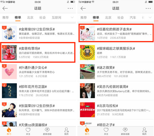 事件發(fā)生后,線上討論迅速鋪開。榜姐率先發(fā)起賣萌是否有罪投票,超級萌寵、超級萌娃等KOL接力擴散引爆。萌熊被關(guān)起來時的話題#賣萌有罪嗎?#,以及四只萌熊越獄后的話題#任嘉倫的熊孩子走失#,分別登頂熱門話題總榜Top2、Top1,雙話題共計9117萬閱讀量。