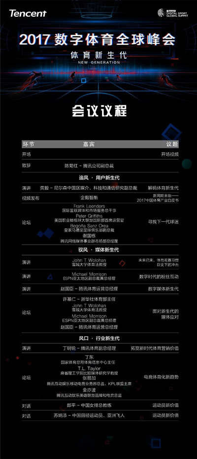 ESPN,市場調(diào)研機(jī)構(gòu)尼爾森的嘉賓,美國錫拉丘斯大學(xué)、美國麻省理工學(xué)院的專家教授以及郎平、蘇炳添等體育明星將共話“體育新生代”,引領(lǐng)行業(yè)新風(fēng)向。